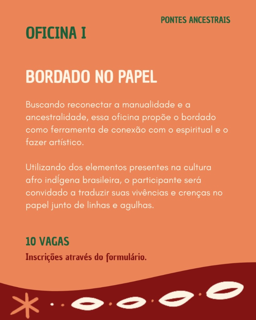 Projeto Pontes Ancestrais realiza oficinas Bordado em Papel, Memórias que Caminham e Mapa Mental no dia 18 de outubro - inscrições abertas