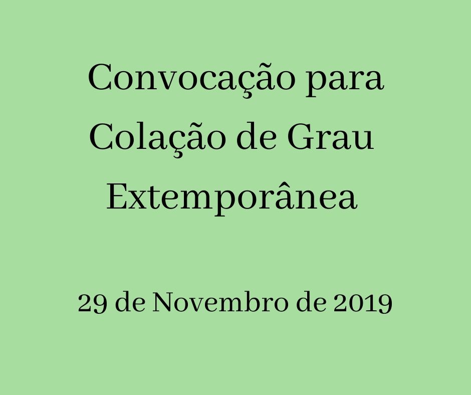 Colação de Grau extemporânea acontecerá no dia 29 de novembro Tweet Tweet por publicado: 27/11/2019 15h25 última modificação: 27/11/2019 15h25 Edital 007/2019 - Convoca acadêmicos para realização da Colação de Grau extemporânea
