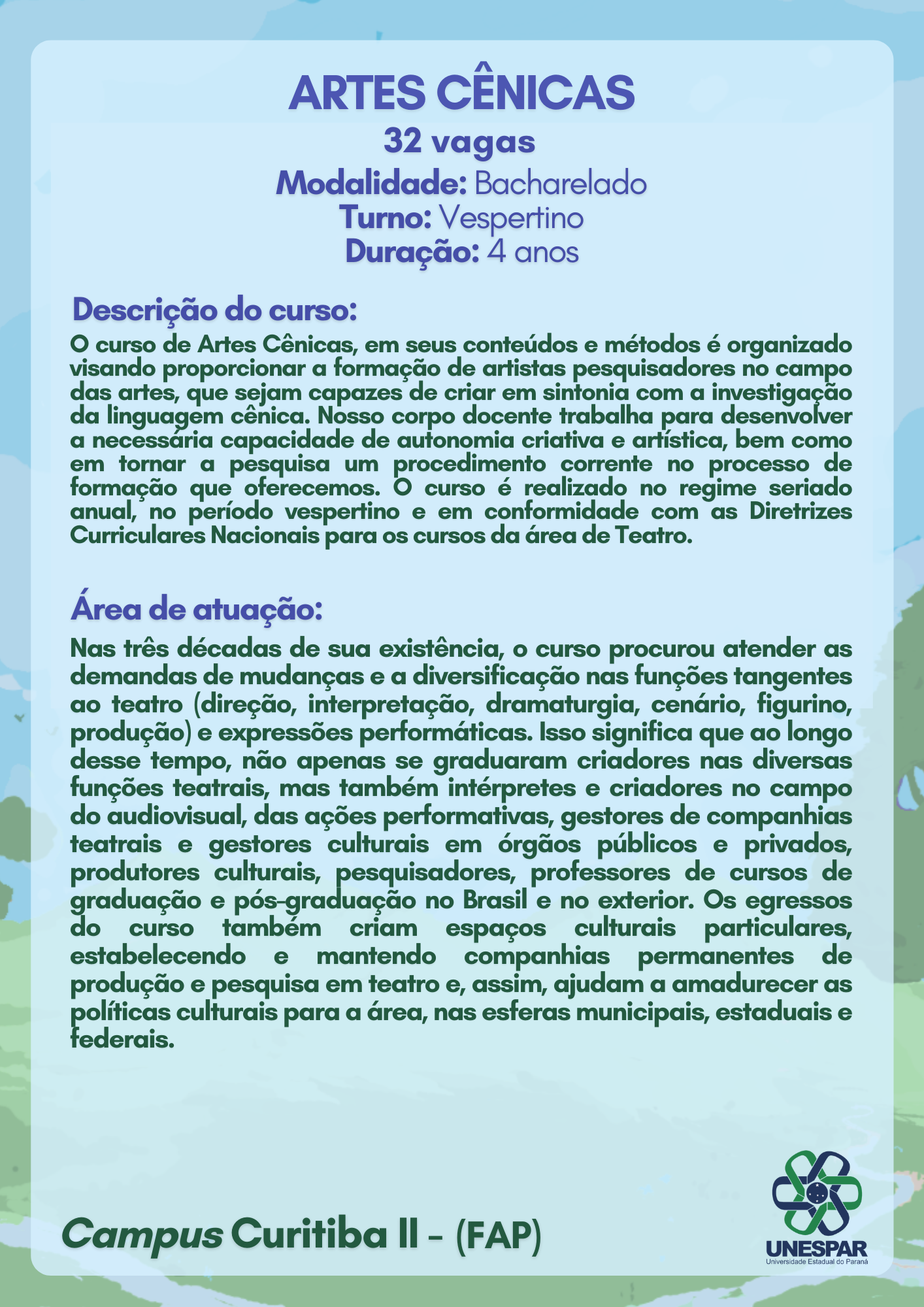 General Conheça mais sobre os cursos ofertados pelo campus de Curitiba II - FAP Tweet Tweet por publicado: 08/06/2017 15h10 última modificação: 08/03/2024 14h33 Exibir carrossel de imagens CONHEÇA MAIS SOBRE OS CURSOS OFERTADOS PELA FAP/UNESPAR: .
