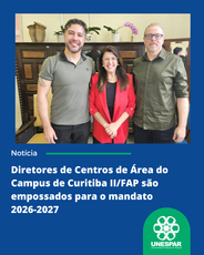 No Campus de Curitiba II/FAP, foram empossados o professor Ricardo Petracca, como diretor do Centro de Área de Música e Musicoterapia, e o professor Robson Rosseto, como diretor do Centro de Área de Artes, para o mandato 2026-2027, com início em 1º de janeiro de 2026.