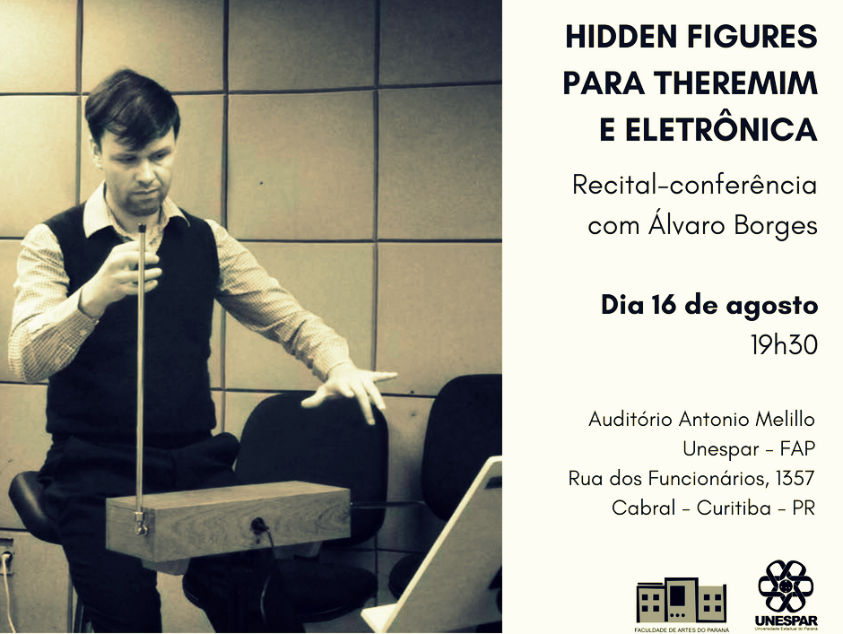 Concerto-comentado de pré-estreia da obra “Hidden Figures” para theremin e eletrônica. Será uma oportunidade de conhecer o instrumento eletrônico centenário, o theremin, e sua abordagem contemporânea na música, conversar sobre o processo de criação do compositor Alvaro Borges e apreciar em primeira mão a composição em tempo real “Hidden Figures”, que se faz exclusivamente por sons emitidos ao vivo pelo theremin, ou pela voz falada, com processamento igualmente em tempo real.