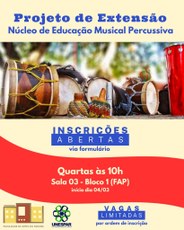 Projeto de Extensão Núcleo de Educação Musical Percussiva está com inscrições abertas