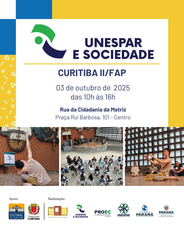 No dia 3 de outubro, das 10h às 16h, acontecerá o evento Unespar e Sociedade, que tem como objetivo divulgar os projetos de extensão e cultura ofertados pelo Campus de Curitiba II/FAP da Universidade Estadual do Paraná (Unespar). O evento será realizado na Rua da Cidadania Matriz, localizada na Praça Rui Barbosa, no centro de Curitiba.