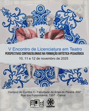 Entre os dias 10 e 12 de novembro, o curso de Licenciatura em Teatro do Campus de Curitiba II/FAP da Universidade Estadual do Paraná (Unespar), promoverá o V Encontro de Licenciatura em Teatro: Perspectivas Contracoloniais na Formação Artística-Pedagógica.